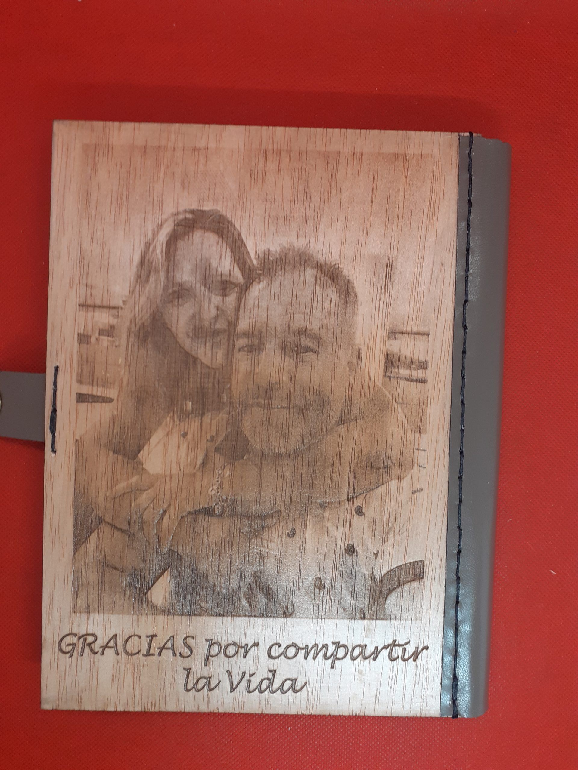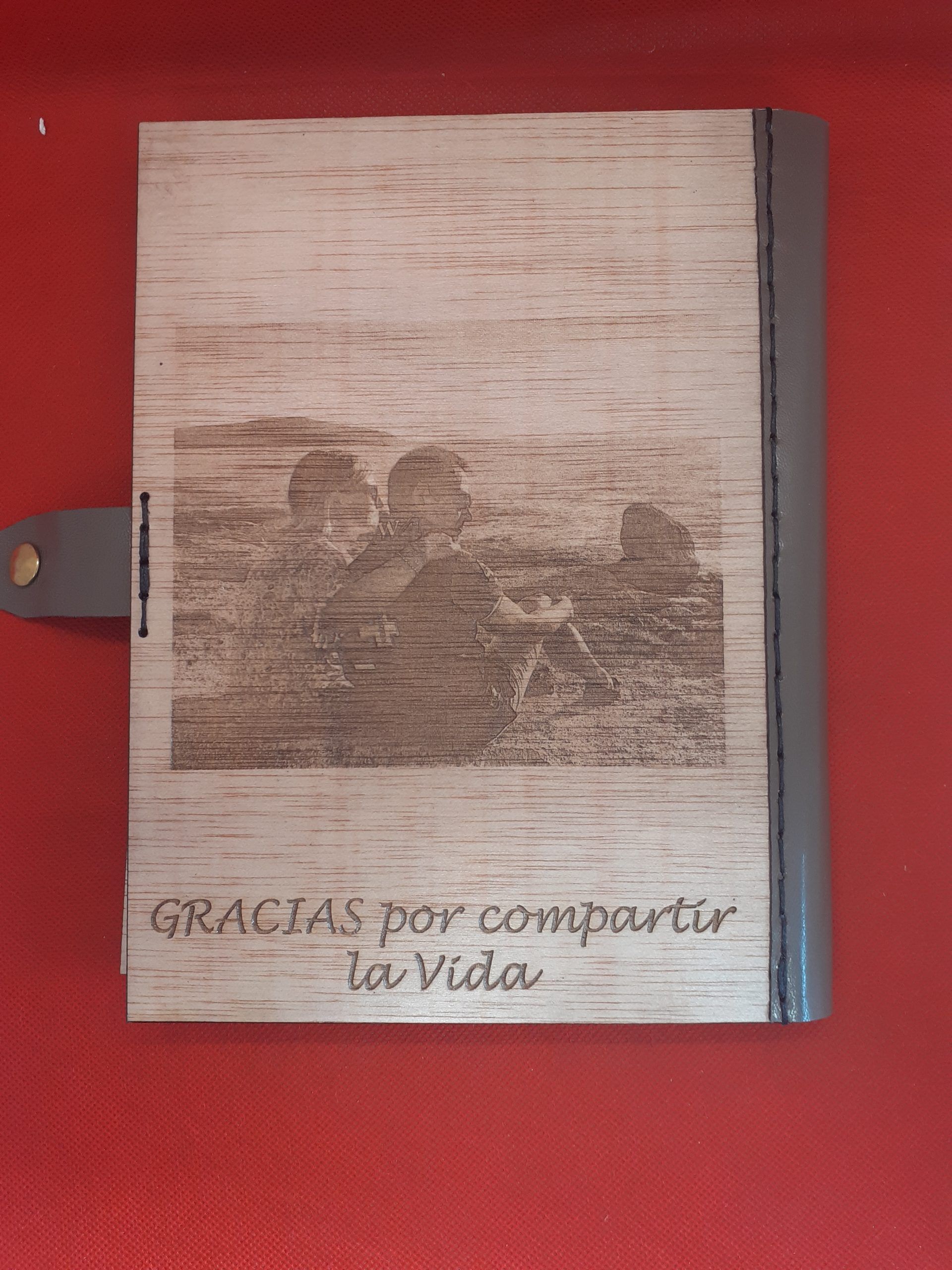 Foto grabada en cuaderno. Se presenta una personalizacion de cuadernos con diferentes grabados según deseos del cliente, cosido a mano y con los cantos de cuero.