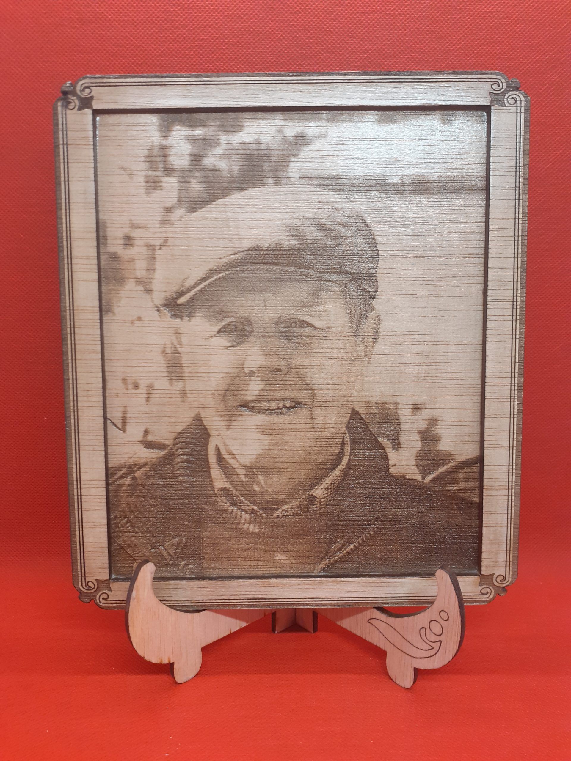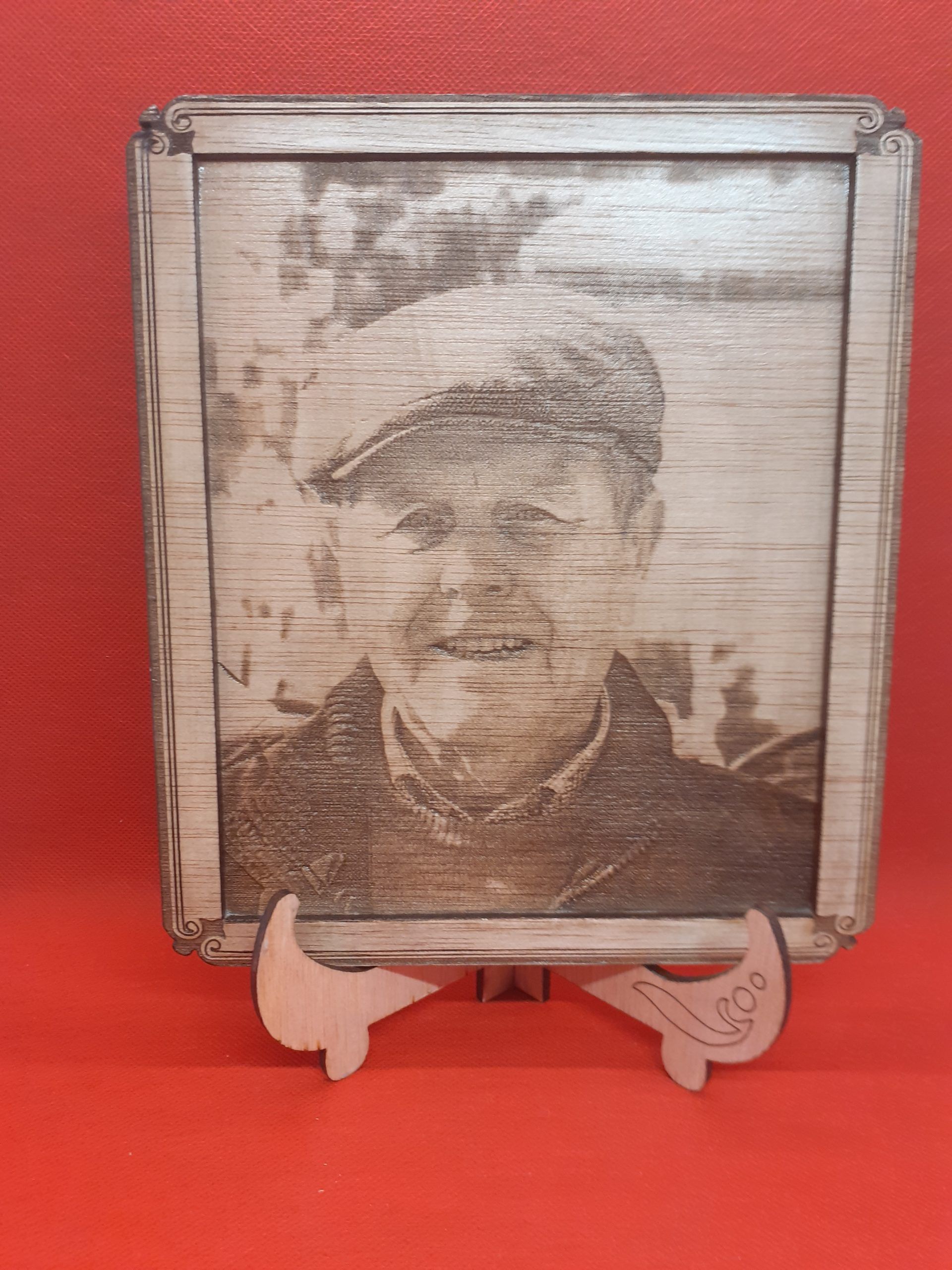 Foto grabada con marco y porta fotos. Su tamaño es de 20 x 30cm. Tiene dos manos de barniz de exteriores.