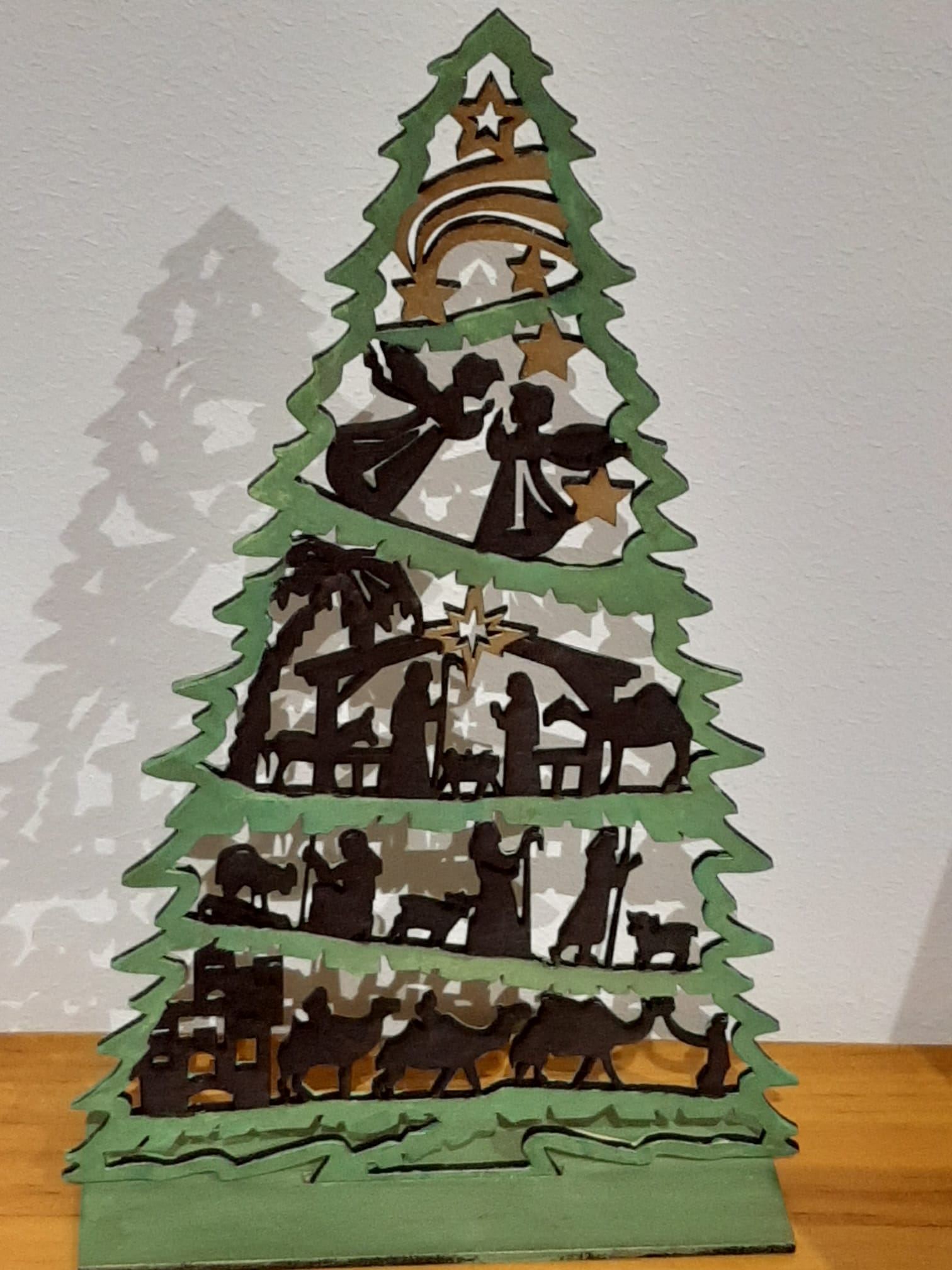 Arbol de navidad en diferentes presentaciones, todos con una altura de 30 cm, en natural, con un valor de 13€, pintado a Mano, con un balor de 15€ IVA incluido.