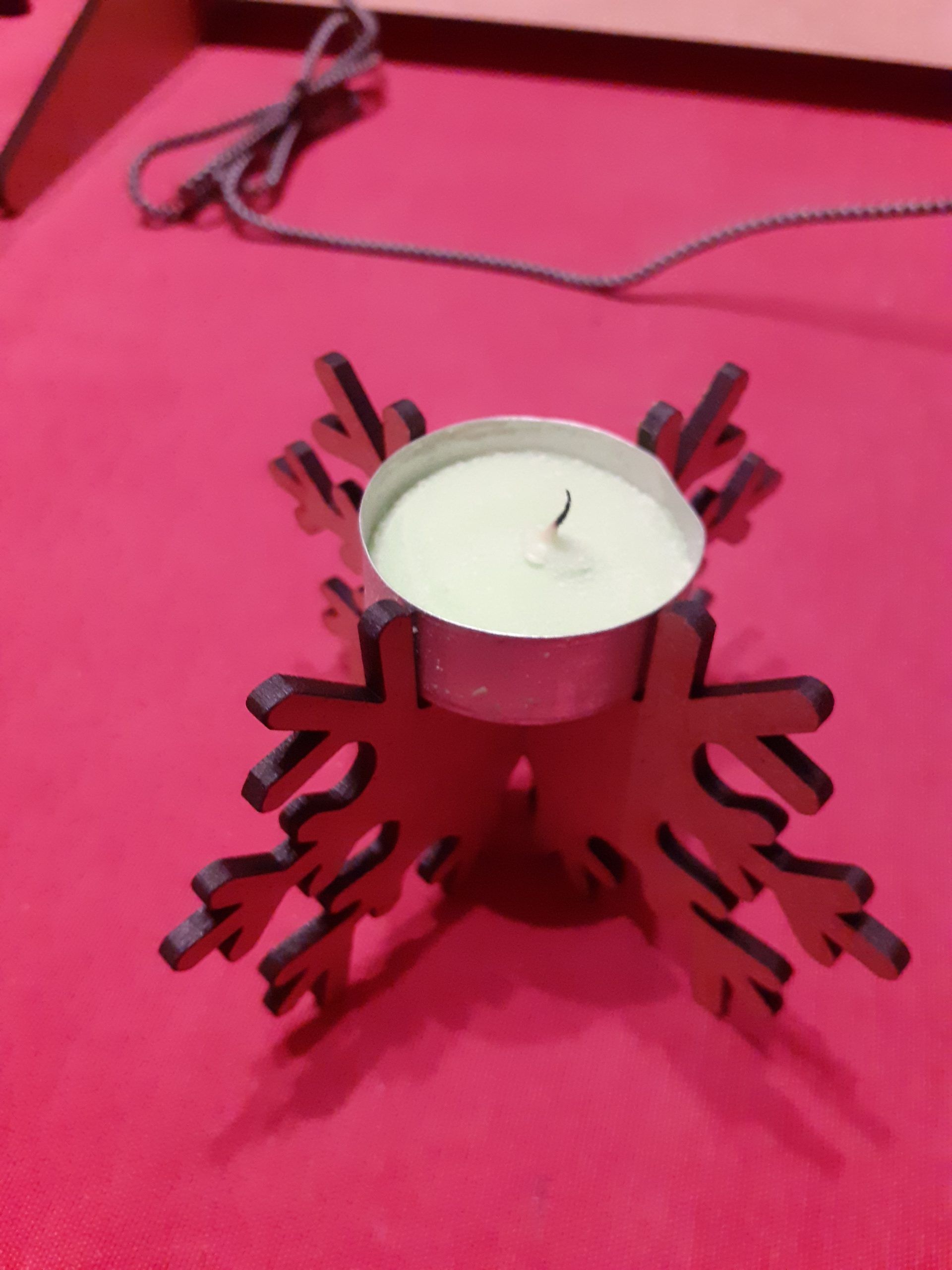 Portavelas en forma de copos de nieve, en color dorado, con un valor de 5€ IVA incluido.