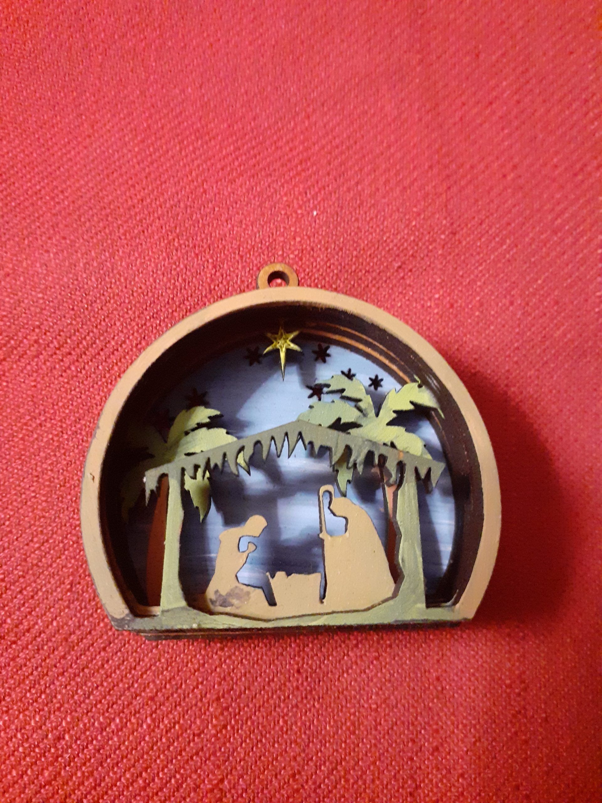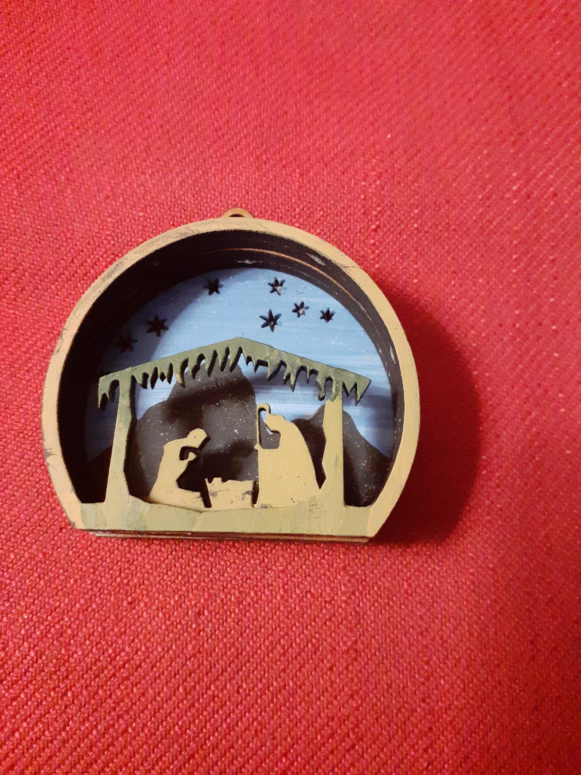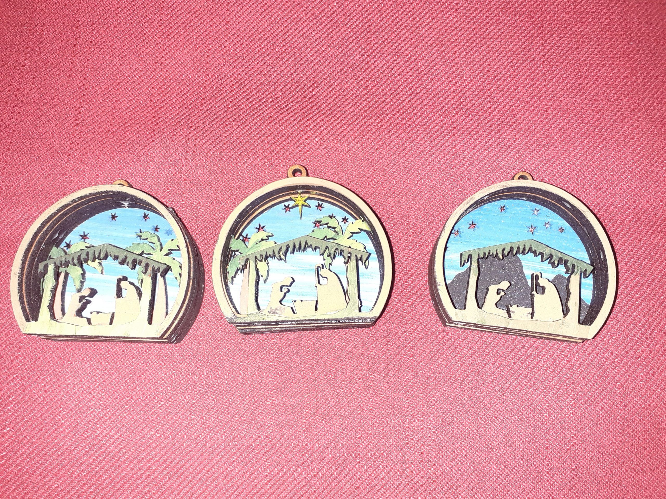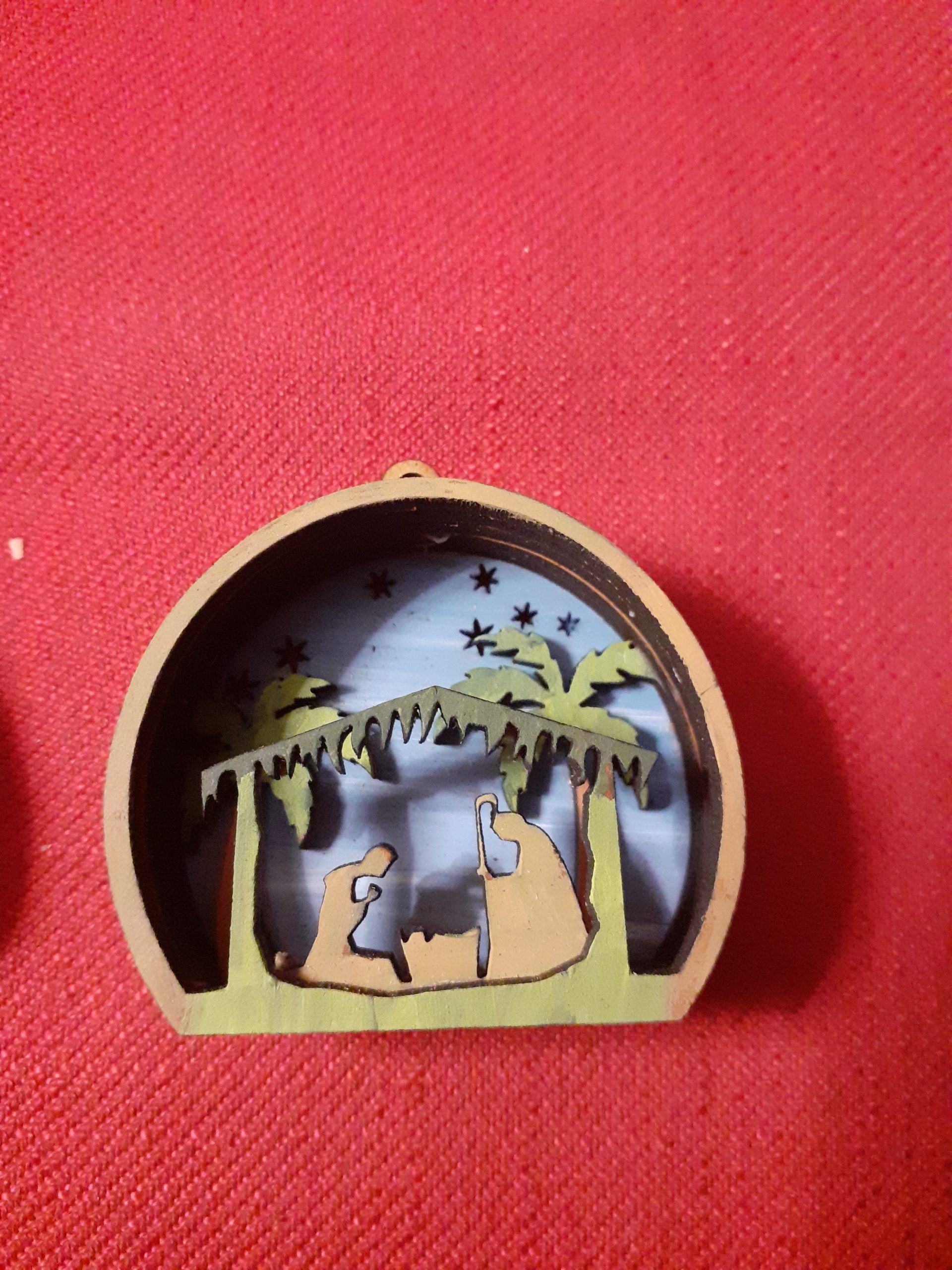 Mini Belén para colgar en árbol de navidad, pintado a mano, tiene un valor de 8€ IVA incluido.