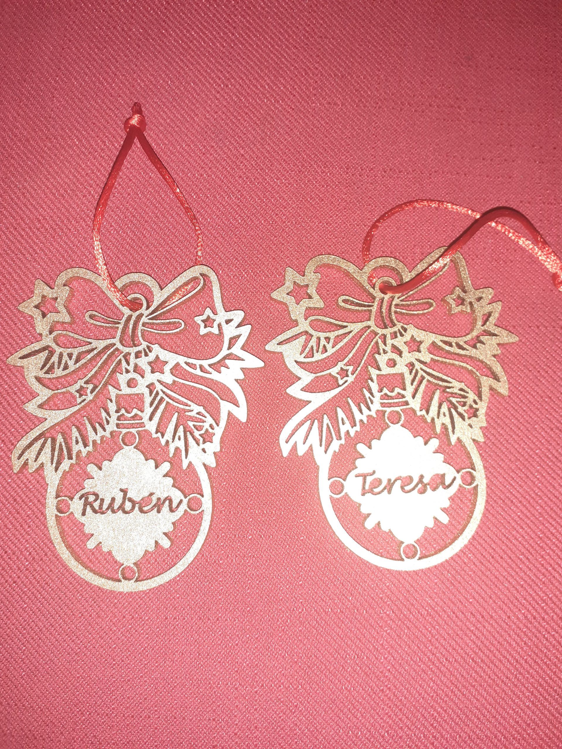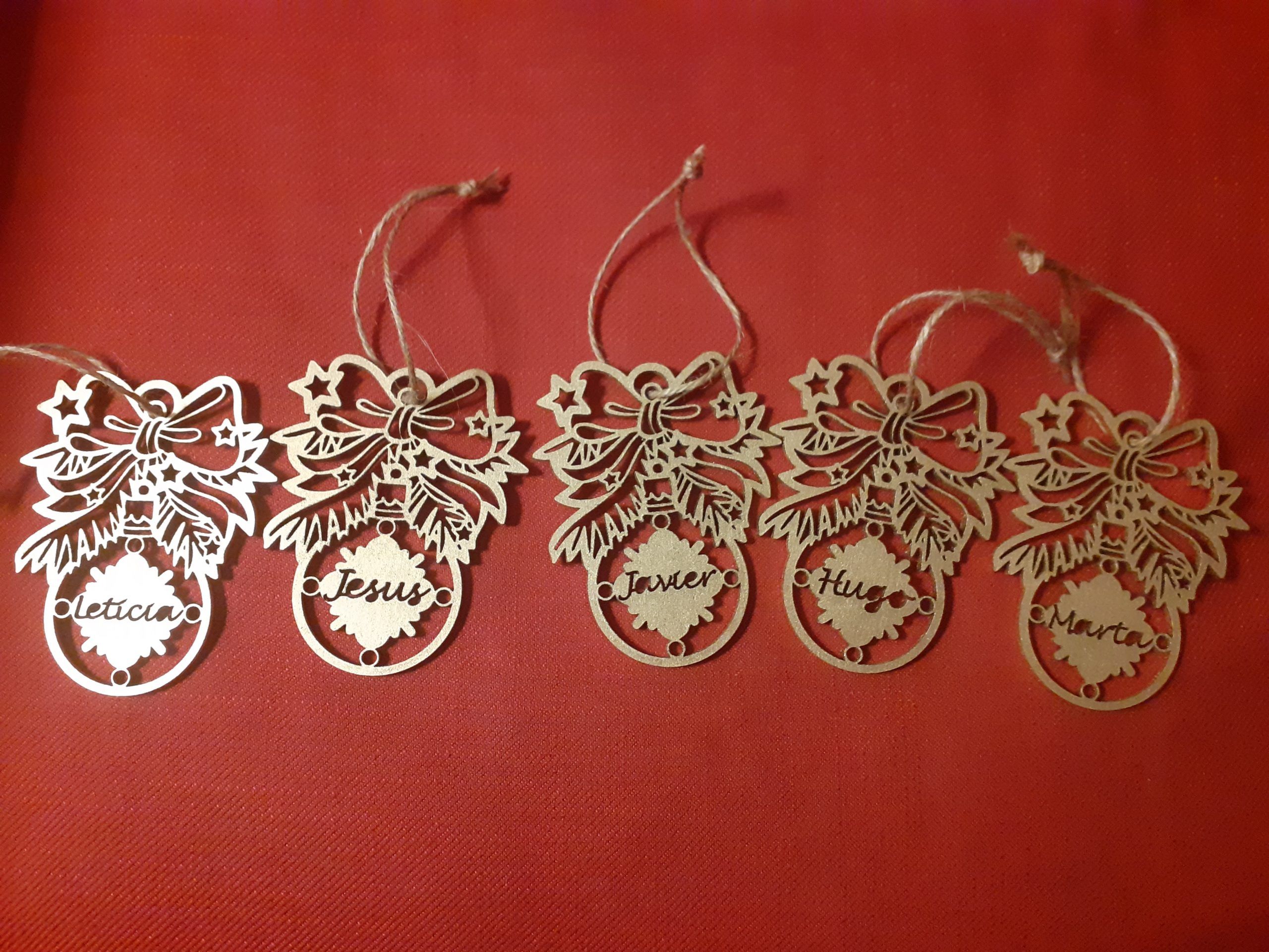 Adornos navidad con nombre personalizado, en color crudo, con un valor de 2.5€ cada uno IVA incluido.